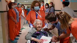 மாட்ரிட்டில் உள்ள வைத்தியசாலையொன்றிலிருந்து பூரண குணமடைந்த நிலையில் நல்ல ஆரோக்கியத்துடன் எலெனா என்ற மூதாட்டி வெளியேறியபோது மருத்துவ ஊழியர்களை அவரை கைதட்டி பாராட்டி வழி அனுப்பி வைத்தனர்.
